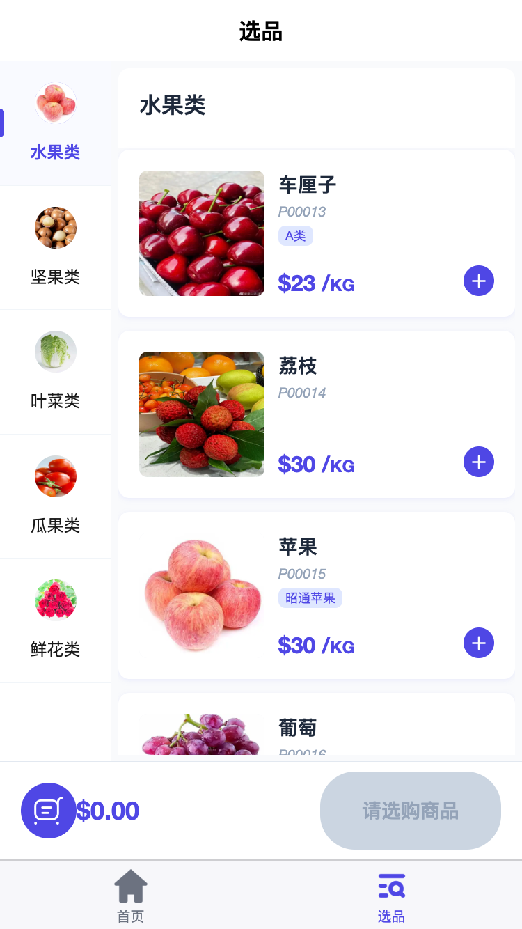 清晰选品:按品类(水果 / 坚果 / 叶菜 / 瓜果 / 鲜花等)精细化管理商品,规格、等级、价格一目了然