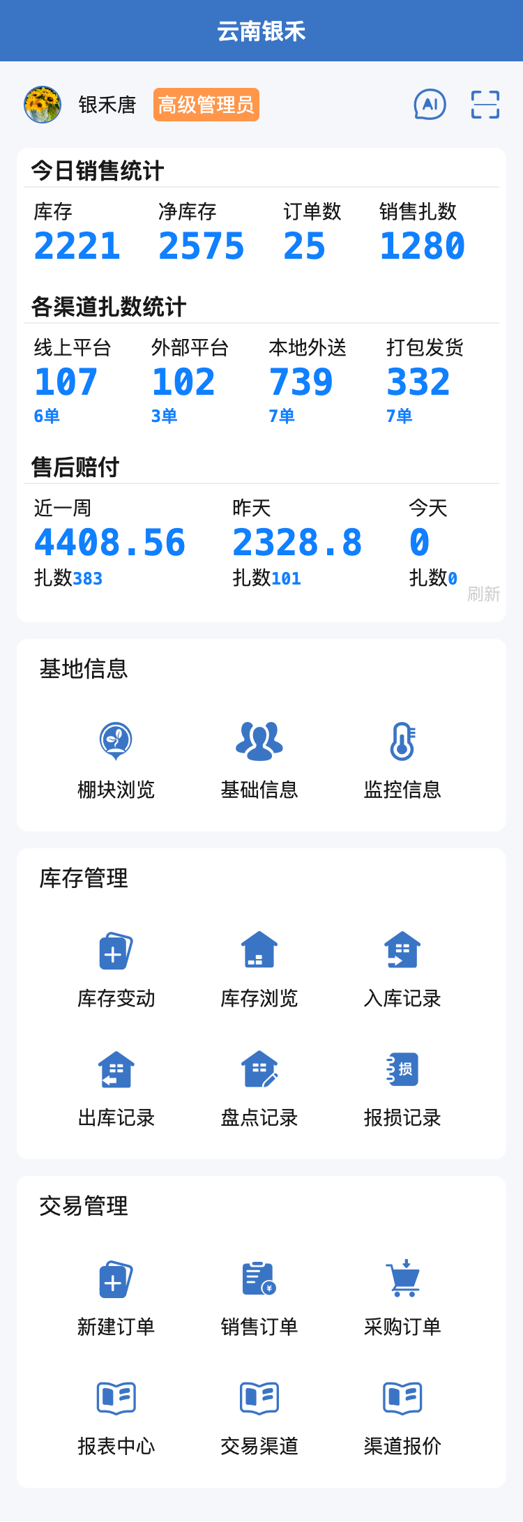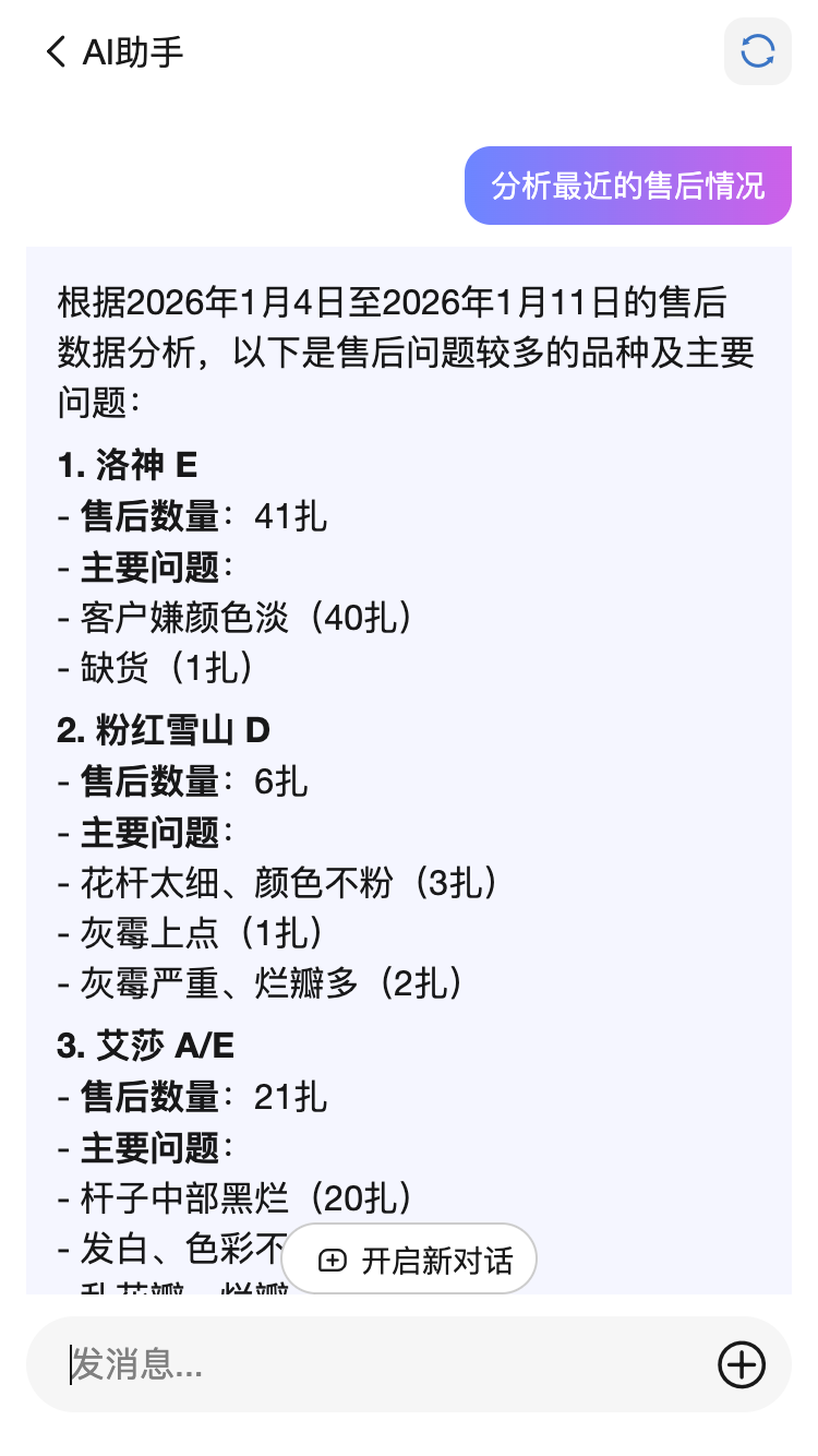 该系统主要解决鲜花行业生产、销售两大痛点,通过该系统可以对生产环节农事管理、生产材料等进行管控,并提供完善的库存、销售管理功能,系统内丰富的统计报表可以让决策者从多个维度即时了解企业经营情况。